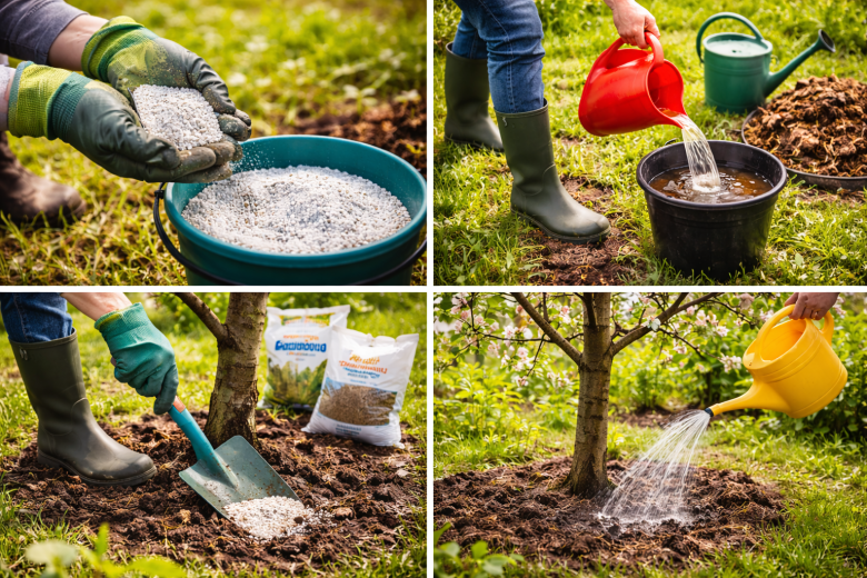 Удобрения вносят не под ствол, а по проекции кроны, где расположены активные корни. Подкормку проводят только по прогретой почве — в холодной земле элементы питания не усваиваются. Такой подход позволяет получить крепкое дерево, устойчивое к болезням, с хорошим цветением и стабильным урожаем.